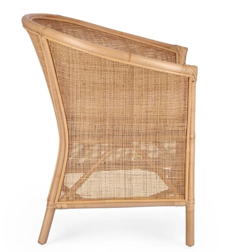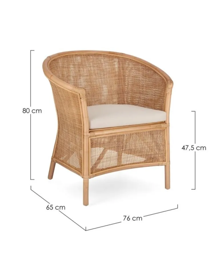 STRUTTURA IN RATTAN, INTRECCIO IN RATTAN. FINITURA A BASE DI NITROCELLULOSA. CUSCINO SFODERABILE CON TESSUTO PER USO INTERNO (30% COTONE, 30% LINO, 40% POLIESTERE)SI RACCOMANDA DI NON ESPORRE L’ARTICOLO ALLA LUCE DIRETTA DEL SOLE E ALLE INTEMPERIE. IMBALLO SENZA CARTONE.