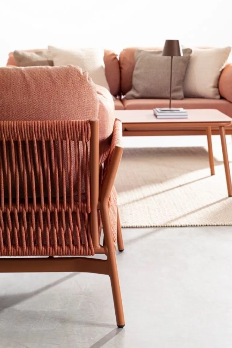 STRUTTURA IN ALLUMINIO VERNICIATO A POLVERE (POLIESTERE). INTRECCIO IN CORDA OLEFIN (100% POLIPROPILENE). CUSCINI SEDUTA E SCHIENALE SFODERABILI IN TESSUTO IDROREPELLENTE OLEFIN (100% POLIPROPILENE).