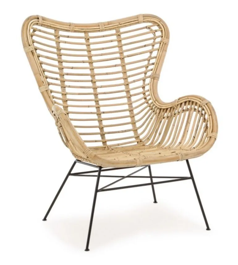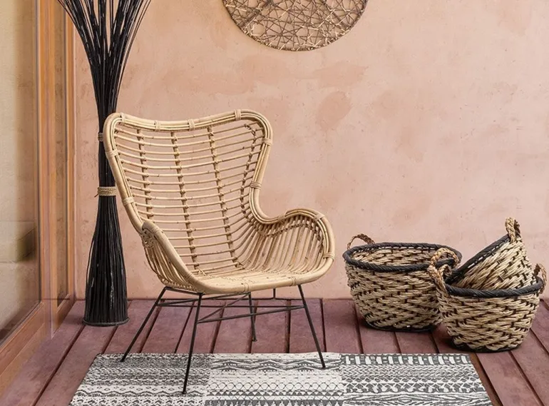 STRUTTURA IN RATTAN, RIFINITURA CON VERNICE MELAMINICA. GAMBE IN ACCIAIO VERNICIATE A POLVERE. SI RACCOMANDA DI NON ESPORRE ALLA LUCE DIRETTA DEL SOLE ED ALLE INTEMPERIE. GAMBE DA ASSEMBLARE.