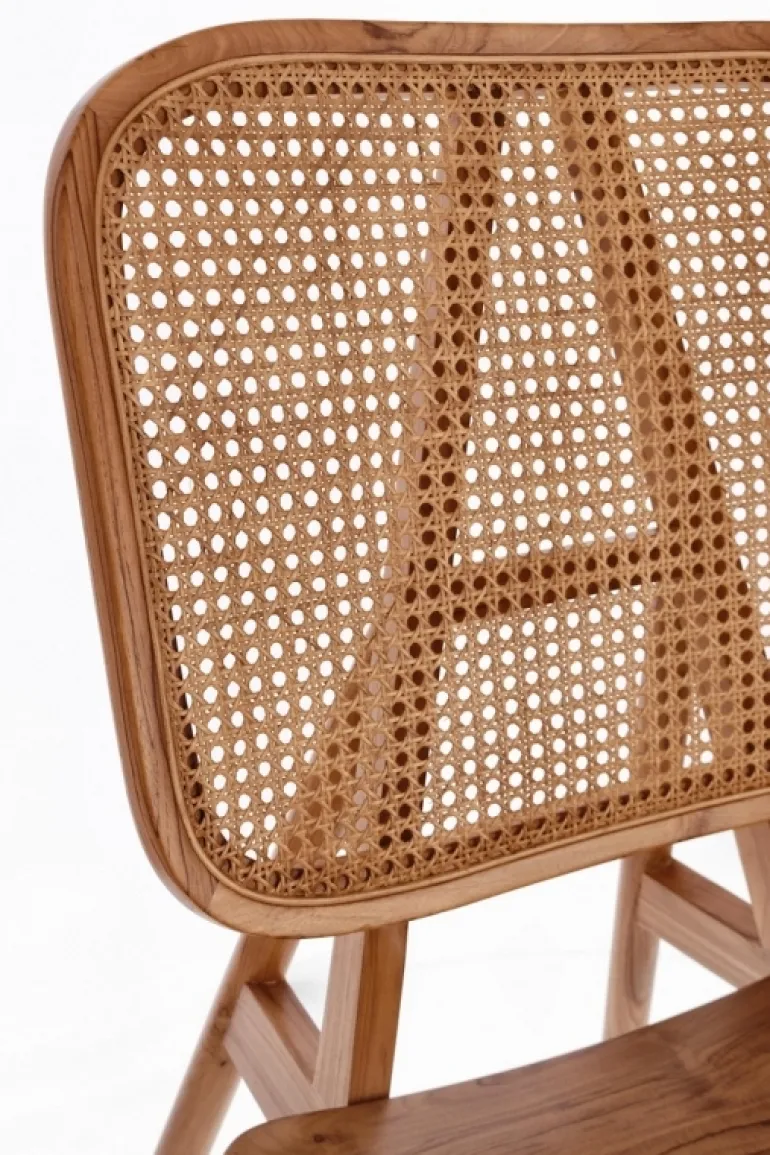 LEGNO TEAK, FINITURA NATURALE CON VERNICE A BASE DI NITROCELLULOSA. SCHIENALE CON INTRECCIO IN RATTAN. SOLO PER USO INTERNO.