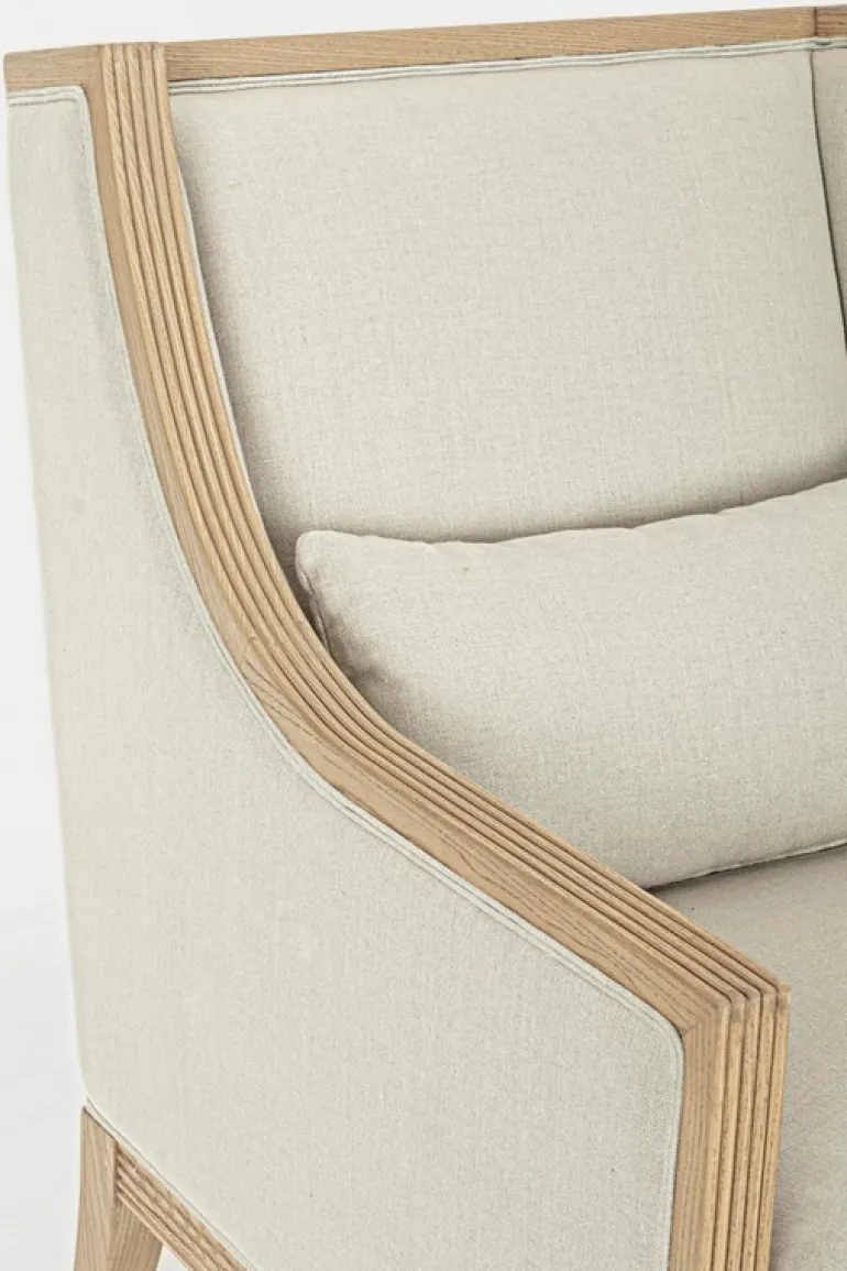 STRUTTURA IN LEGNO DI FRASSINO, RIVESTIMENTO 100% LINO. DENSITA’ IMBOTTITURA IN SCHIUMA POLIURETANICA SEDUTA 30KG/M3, SCHIENALE 25KG/M3.CUSCINI SFODERABILI. COMPRENSIVO DI RUOTE ANTERIORI IN ACCIAIO ZINCATO.