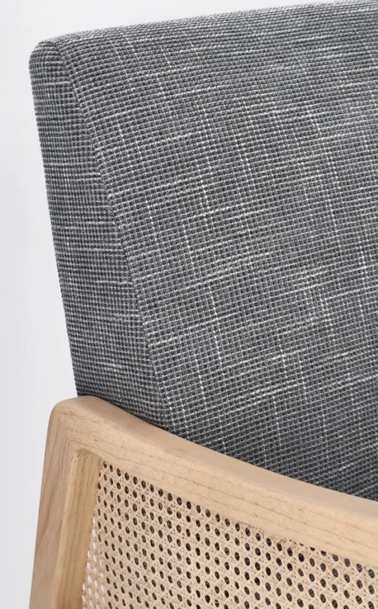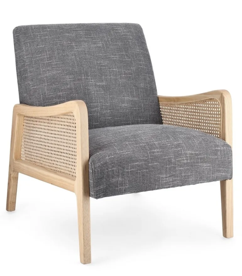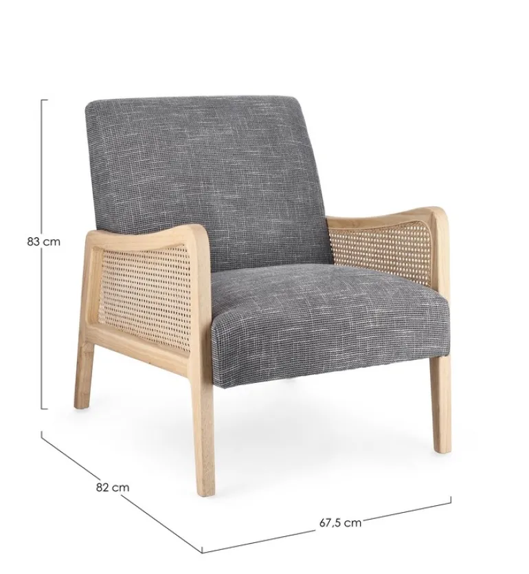 STRUTTURA IN LEGNO DI PINO E COMPENSATO. GAMBE IN RUBBERWOOD. BRACCIOLI CON INSERTI IN RATTAN. RIVESTIMENTO IN POLIESTERE. DENSITA’ IMBOTTITURA IN SCHIUMA POLIURETANICA 24 KG/M3. NON SFODERABILE. GAMBE DA ASSEMBLARE.