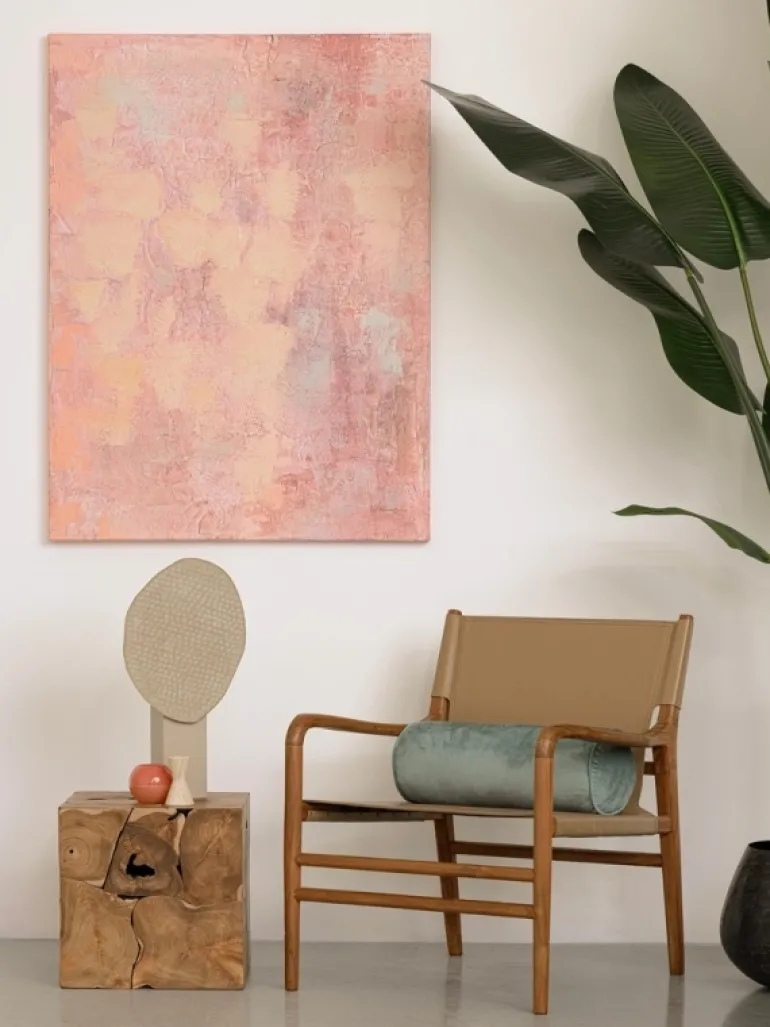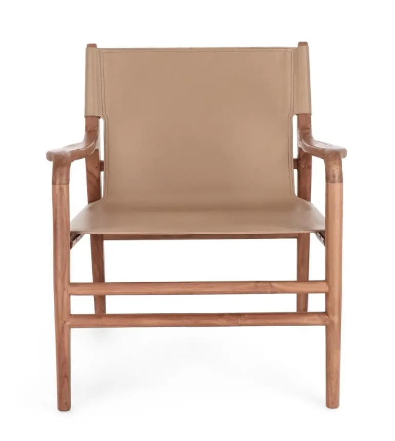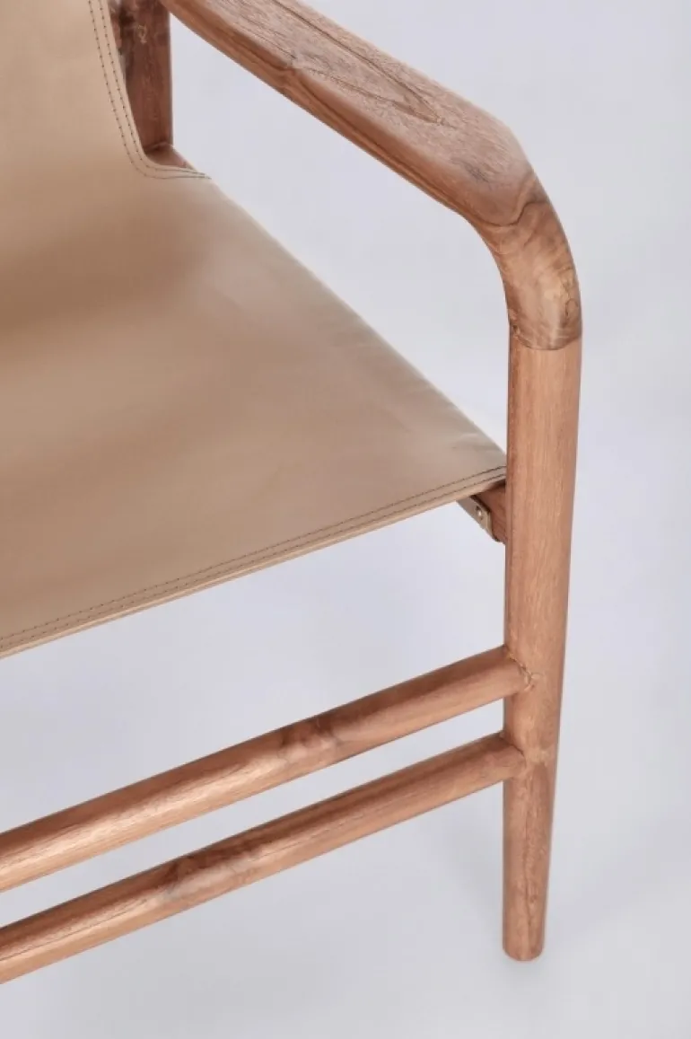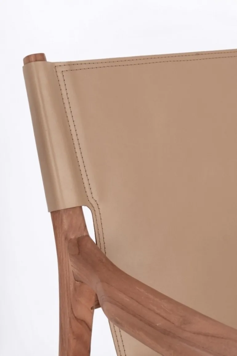 LEGNO TEAK, FINITURA CON VERNICE A BASE D’ACQUA. SEDUTA E SCHIENALE RIVESTITI IN VERA PELLE (PIENO FIORE).