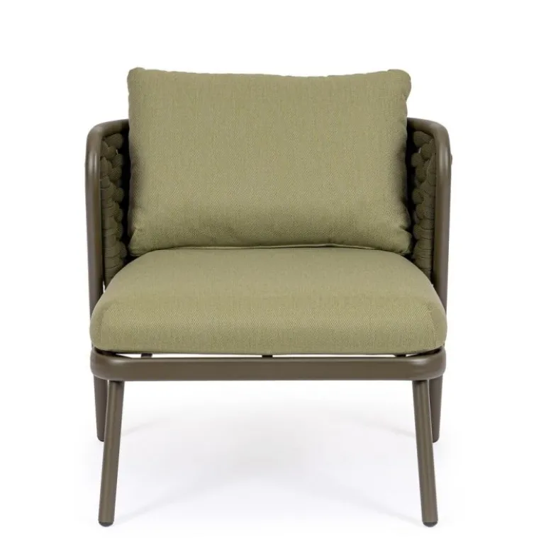STRUTTURA IN ALLUMINIO VERNICIATO A POLVERE (POLIESTERE). INTRECCIO IN CORDA DI TEXTILENE CON IMBOTTITURA IN GOMMA NITRILICA. CUSCINO SEDUTA E SCHIENALE SFODERABILE IN TESSUTO IDROREPELLENTE OLEFIN (100% POLIPROPILENE).
