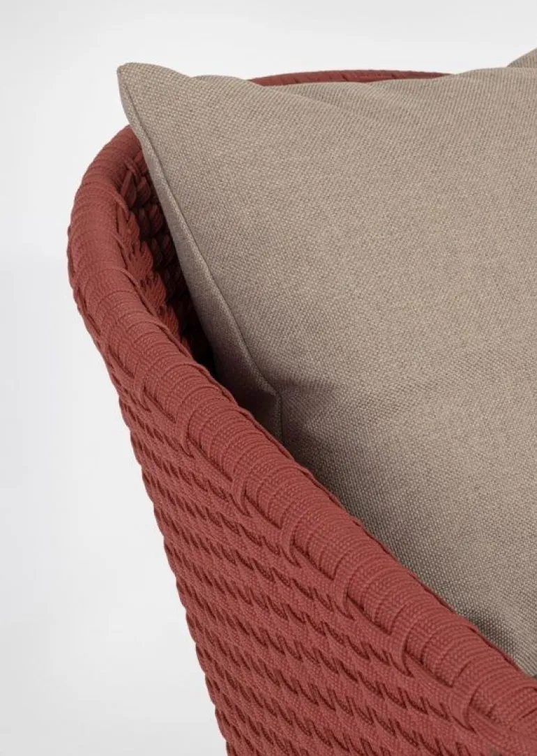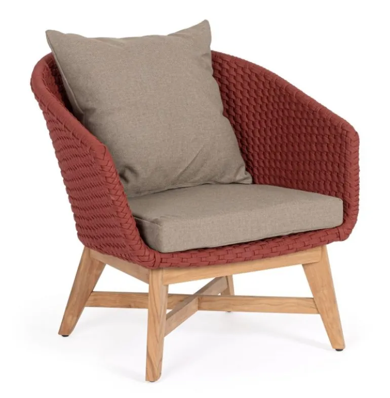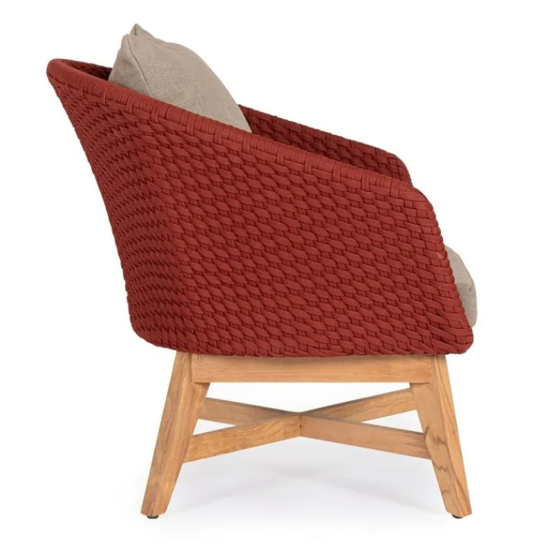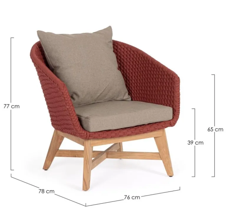 SEDUTA CON STRUTTURA IN ALLUMINIO VERNICIATA A POLVERE (POLIESTERE). INTRECCIO IN CORDA OLEFIN (100% POLIPROPILENE). CUSCINO SEDUTA E SCHIENALE SFODERABILE CON TESSUTO IDROREPELLENTE SUNPROOF OLEFIN (100% POLIPROPILENE). GAMBE IN TEAK – SVLK (LEGNO CERTIFICATO PROVENIENTE DA FORESTE SOSTENIBILI). VITERIA IN ACCIAIO GALVANIZZATO. GAMBE DA ASSEMBLARE. ATTENZIONE: PRIMA DI PROCEDERE AL MONTAGGIO, ASSICURARSI CHE LA NUMERAZIONE SEDUTA-GAMBE COINCIDA.