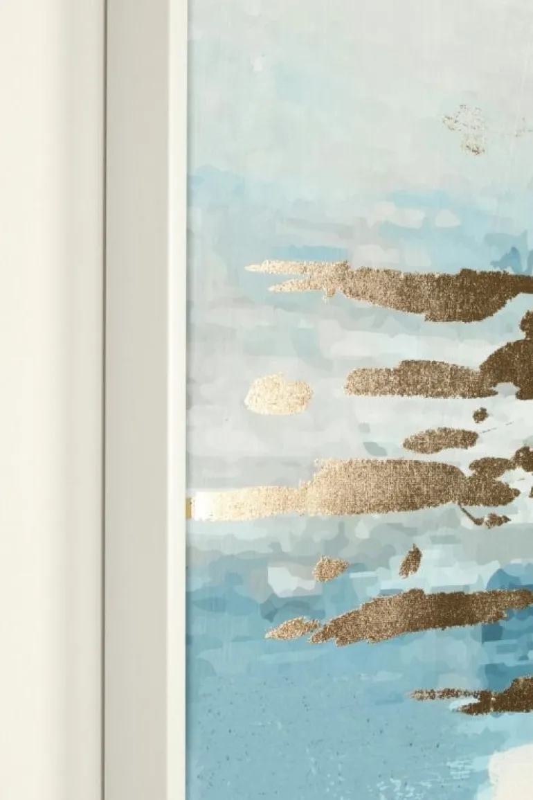 STAMPA SU TELA DIPINTA A MANO CON APPLICAZIONI FOGLI DORATI. CORNICE IN MDF.