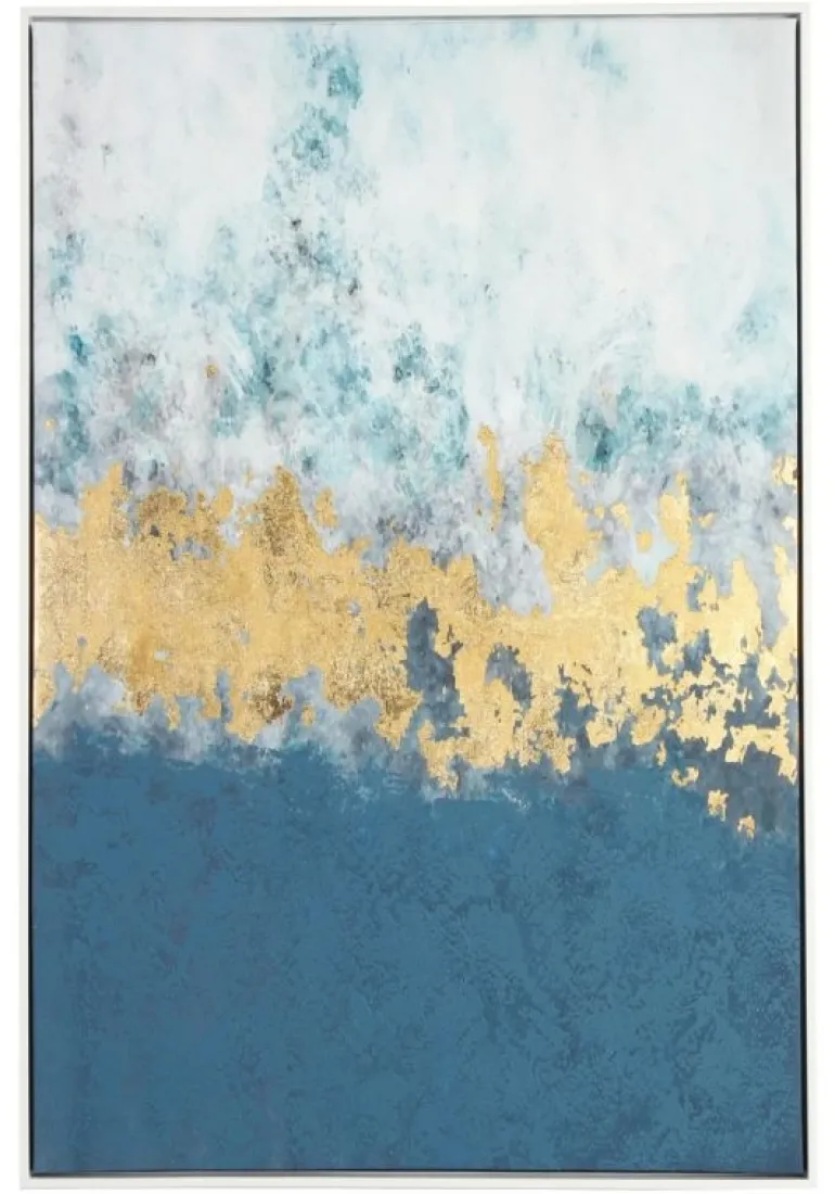 STAMPA SU TELA DIPINTA A MANO CON APPLICAZIONI FOGLI DORATI. CORNICE IN MDF.