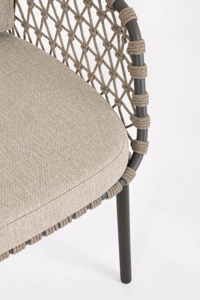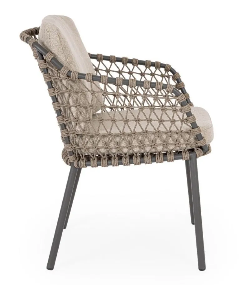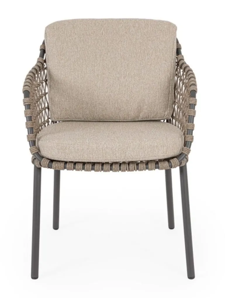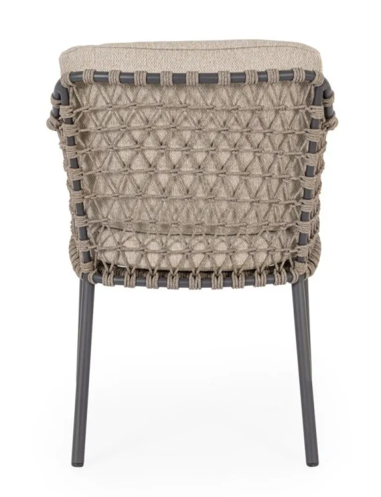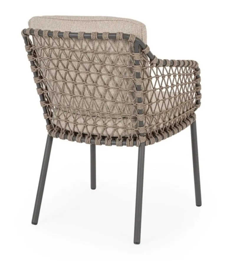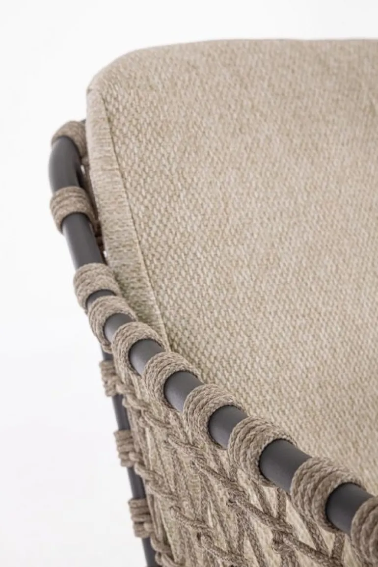 STRUTTURA IN ACCIAIO INOSSIDABILE (201). INTRECCIO PER ESTERNO IN CORDA (POLIPROPILENE). CUSCINI SFODERABILI IN TESSUTO IDROREPELLENTE SUNPROOF OLEFIN (100%POLYPROPYLENE).