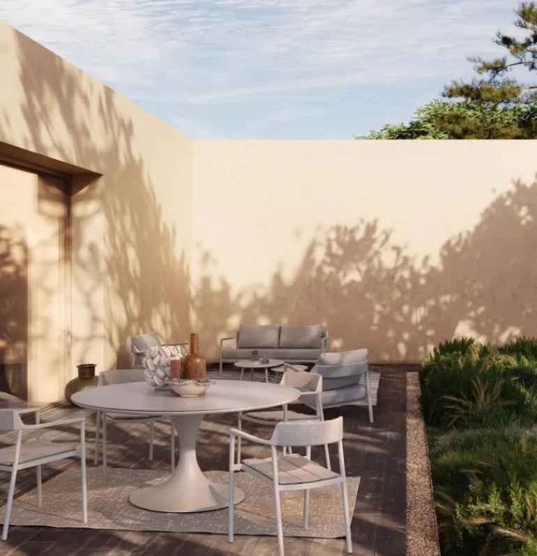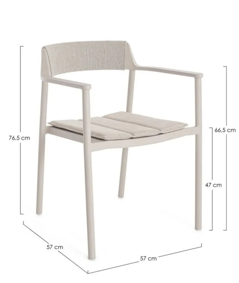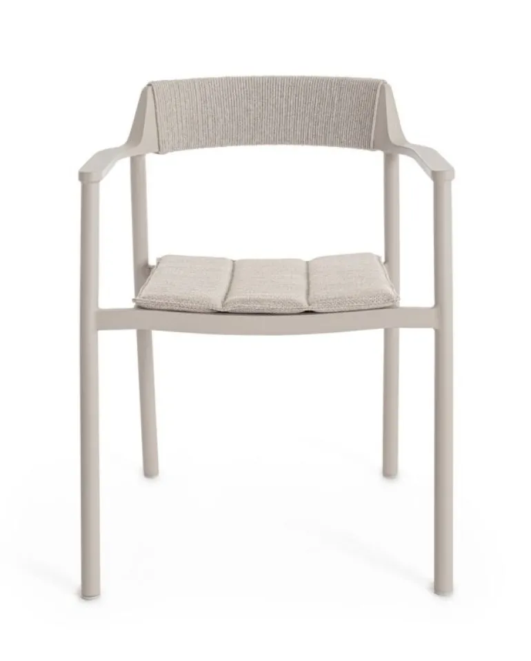 STRUTTURA IN ALLUMINIO VERNICIATO A POLVERE (POLIESTERE). SCHIENALE CON INTRECCIO IN CORDA DI POLIESTERE. CUSCINO SEDUTA SFODERABILE CON TESSUTO IDROREPELLENTE OLEFIN (100% POLIPROPILENE). IMPILABILE.