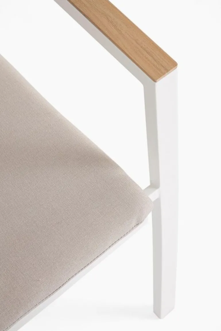 STRUTTURA IN ALLUMINIO VERNICIATO A POLVERE (POLIESTERE). BRACCIOLI IN ALLUMINIO CON VERNICIATURA EFFETTO LEGNO. CUSCINO SEDUTA SFODERABILE CON TESSUTO IDROREPELLENTE OLEFIN (100% POLIPROPILENE). IMPILABILE.