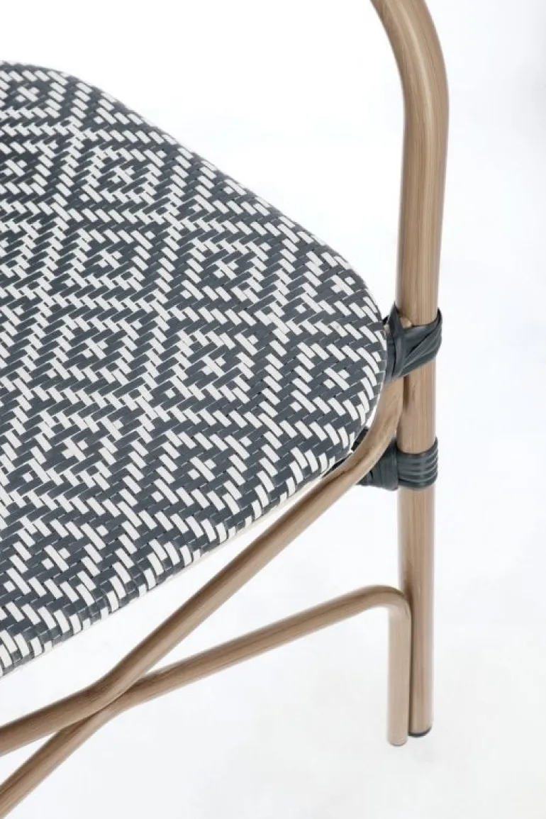 STRUTTURA IN ALLUMINIO VERNICIATA A POLVERE (POLIESTERE), EFFETTO NATURALE. SEDUTA E SCHIENALE IN TEXTILENE. IMPILABILE. IMBALLO SENZA CARTONE.