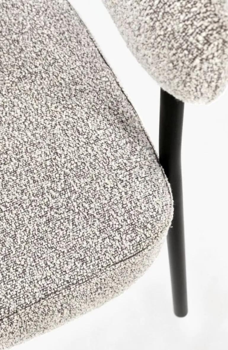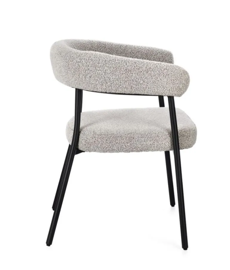 STRUTTURA IN COMPENSATO. GAMBE IN ACCIAIO VERNICIATO A POLVERE. IMBOTTITURA IN SCHIUMA POLIURETANICA DENSITA’ 22 KG/M3. RIVESTIMENTO IN POLIESTERE EFFETTO BOUCLE’ . DA ASSEMBLARE.