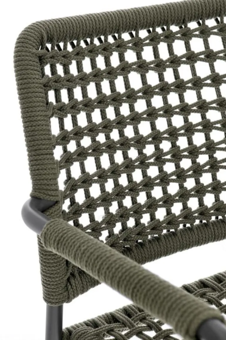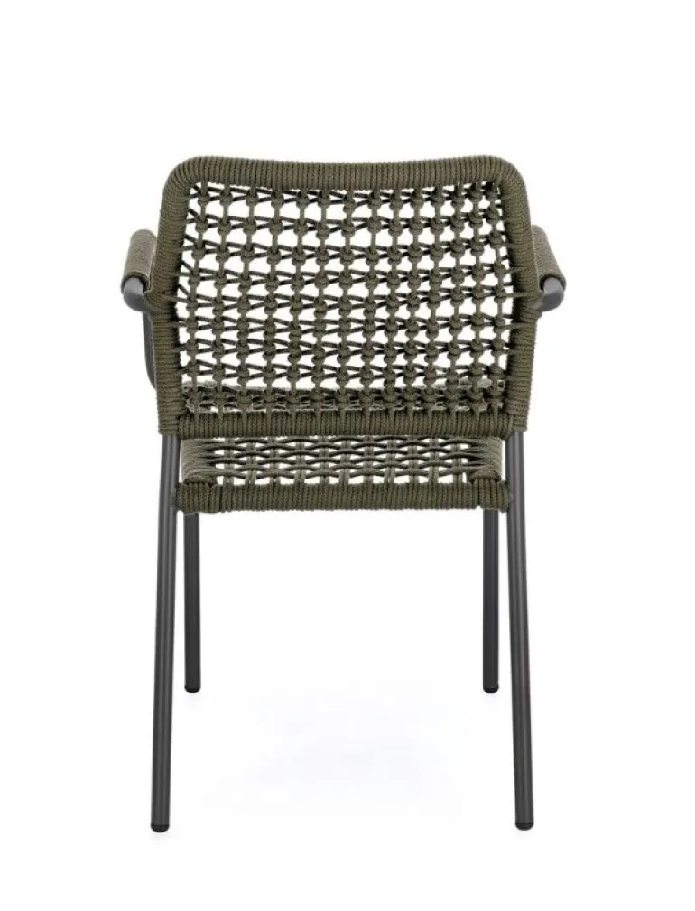 STRUTTURA IN ALLUMINIO VERNICIATA A POLVERE (POLIESTERE). INTRECCIO PER ESTERNO IN CORDA OLEFIN (POLIPROPILENE). IMPILABILE.