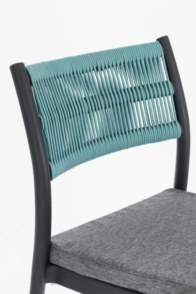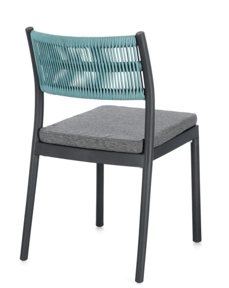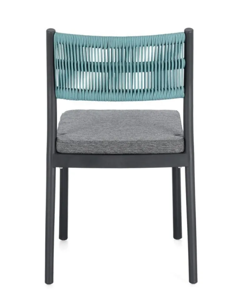 POLIPROPILENE (PP), RESISTENTE AI RAGGI UV. SCHIENALE CON INTRECCIO IN CORDA DI POLIESTERE. CUSCINO SEDUTA SFODERABILE CON TESSUTO IDROREPELLENTE POLIESTERE. IMPILABILE.