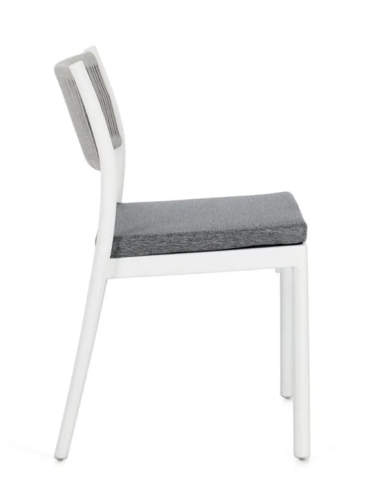 POLIPROPILENE (PP), RESISTENTE AI RAGGI UV. SCHIENALE CON INTRECCIO IN CORDA DI POLIESTERE. CUSCINO SEDUTA SFODERABILE CON TESSUTO IDROREPELLENTE POLIESTERE. IMPILABILE.