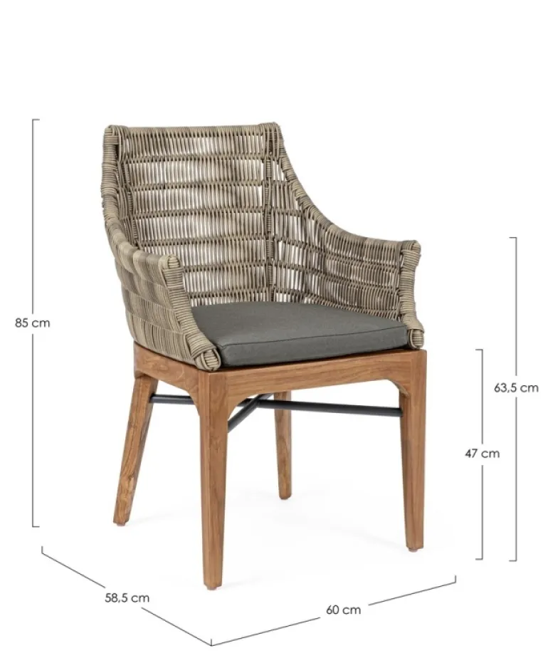 STRUTTURA SCHIENALE IN ALLUMINIO VERNICIATO A POLVERE (POLIESTERE). SEDUTA E GAMBE IN TEAK – SVLK (LEGNO CERTIFICATO PROVENIENTE DA FORESTE SOSTENIBILI). INTRECCIO PER ESTERNO IN FIBRA SINTETICA TONDA 5MM. CUSCINO SFODERABILI IN TESSUTO SUNPROOF OLEFIN (100% POLIPROPILENE). IMBOTTITURA PER ESTERNO “QUICK DRY FOAM” (ANTIUMIDITA’).