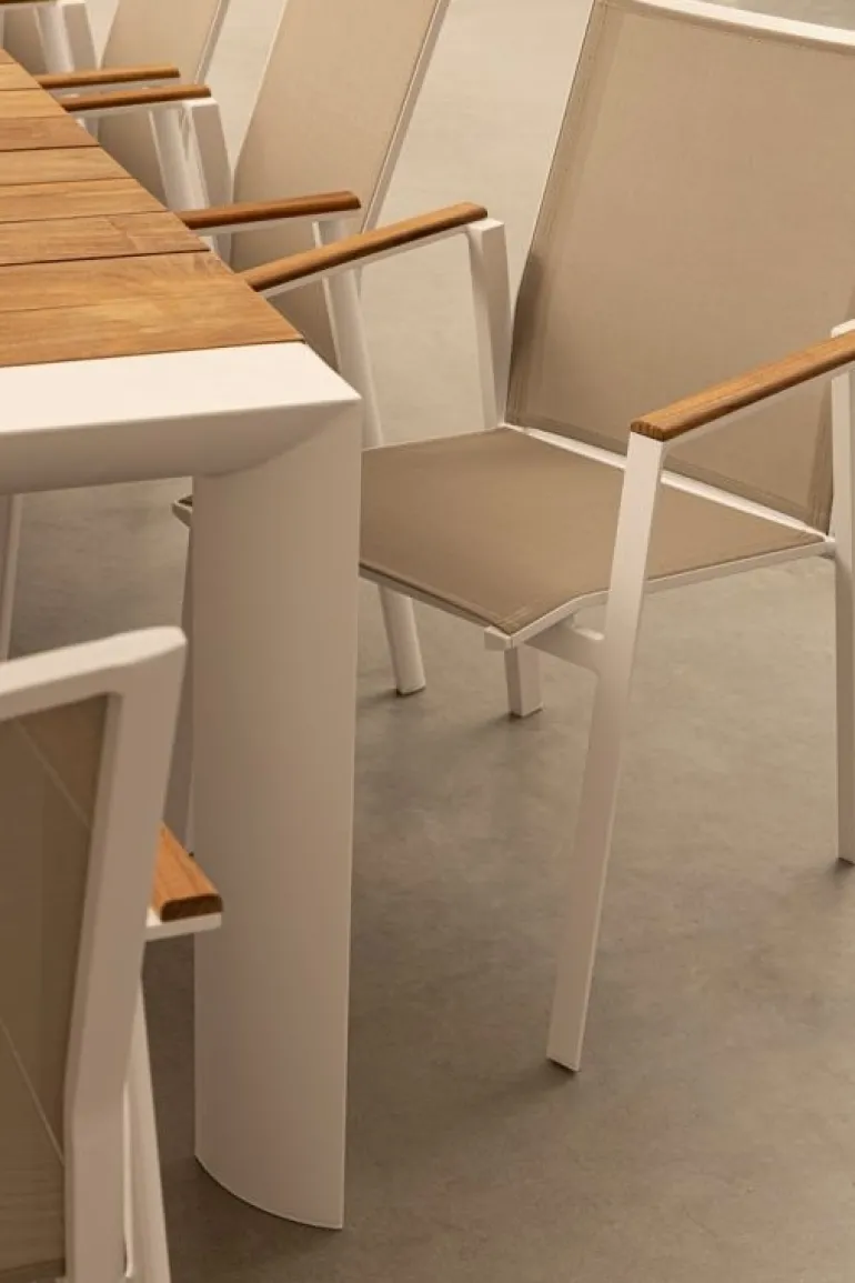 STRUTTURA IN ALLUMINIO, VERNICIATO A POLVERE (POLIESTERE). BRACCIOLI CON INSERTI IN TEAK. SEDUTA E SCHIENALE RIVESTITI IN TEXTILENE PHIFER 1X1. IMPILABILE.