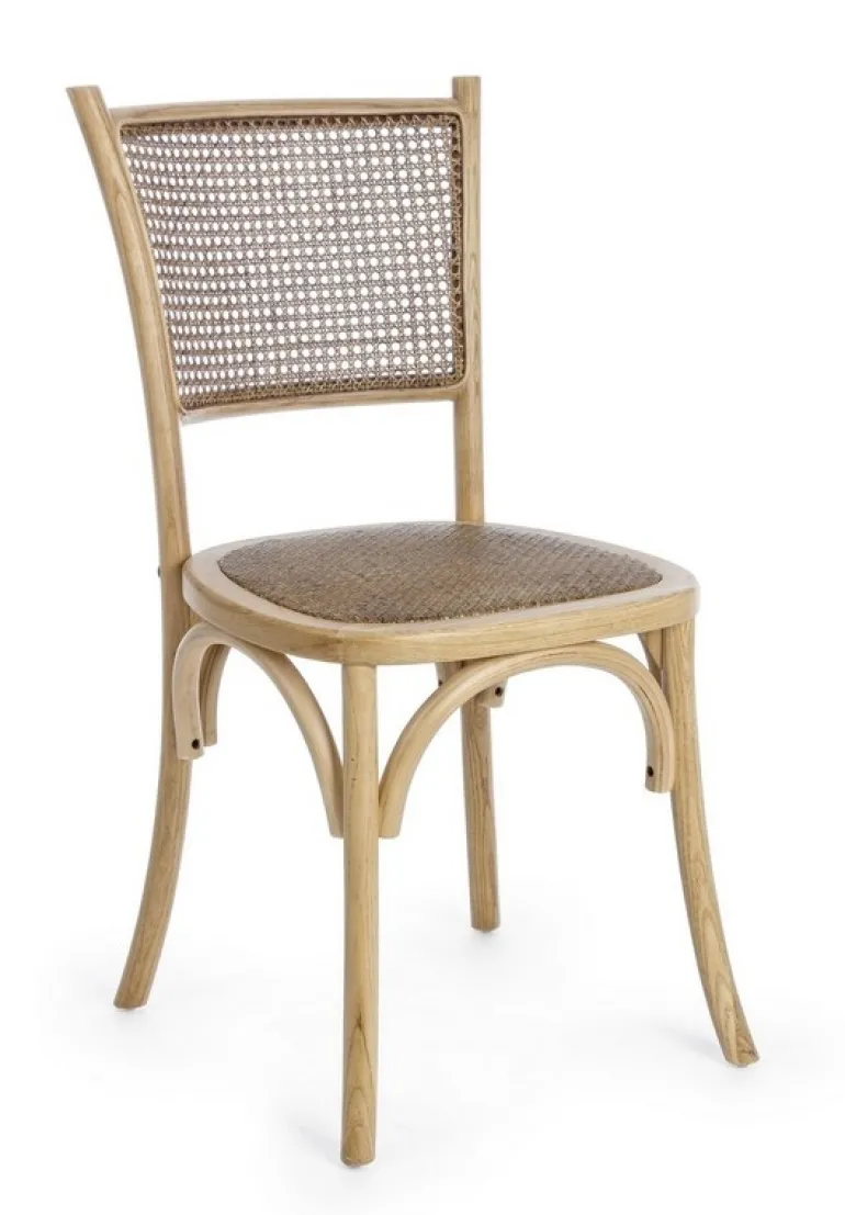 STRUTTURA IN LEGNO DI OLMO, SCHIENALE E SEDUTA IMBOTTITA RIVESTITE IN RATTAN NATURALE, FINITURA POLIURETANICA. IMBALLO SENZA CARTONE.