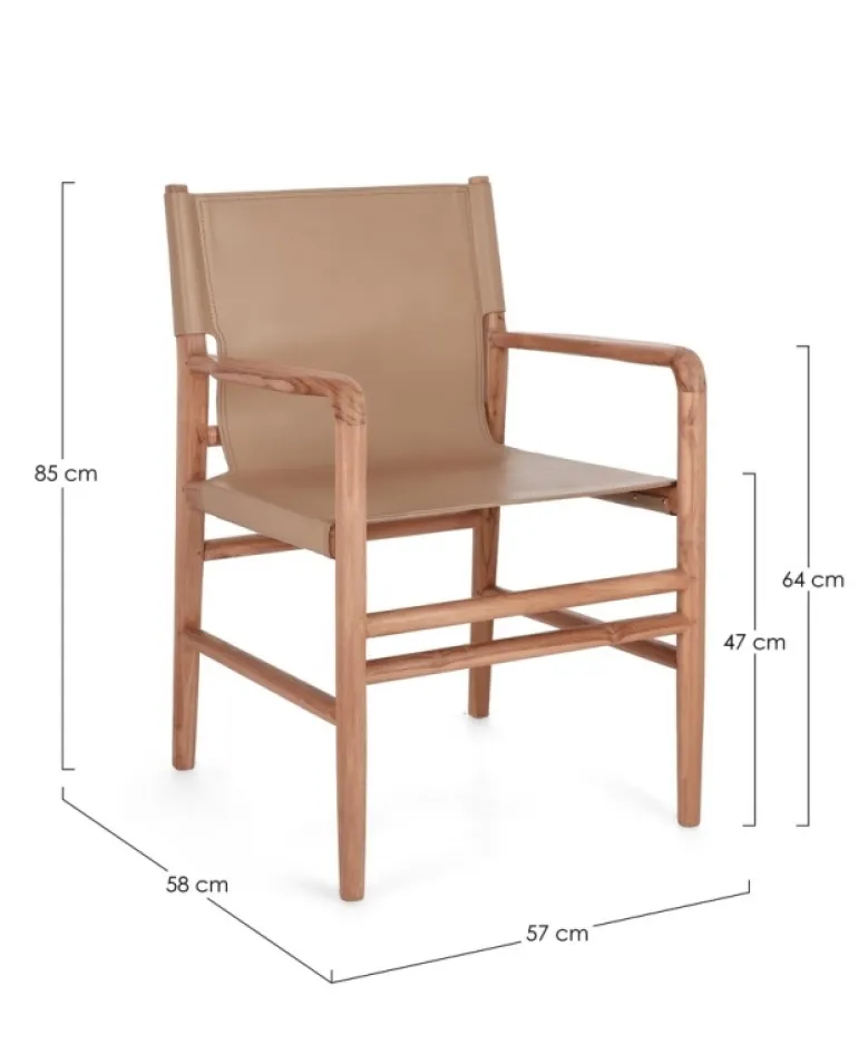 LEGNO TEAK, FINITURA CON VERNICE A BASE D’ACQUA. SEDUTA E SCHIENALE RIVESTITI IN VERA PELLE (PIENO FIORE).