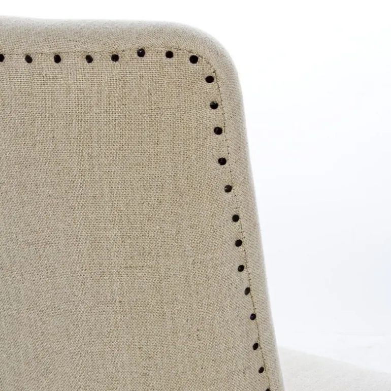 STRUTTURA IN LEGNO DI QUERCIA, RIVESTIMENTO IN LINO. SCHIENALE CON APPLICAZIONE DI BORCHIE IN METALLO. DENSITA’ IMBOTTITURA IN SCHIUMA POLIURETANICA SEDUTA 30KG/M3, SCHIENALE 25KG/M3.