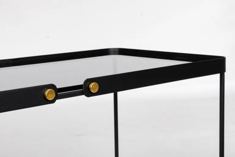 STRUTTURA IN ACCIAIO, VERNICIATA A POLVERE EPOSSIDICA. PIANO IN VETRO TEMPERATO.