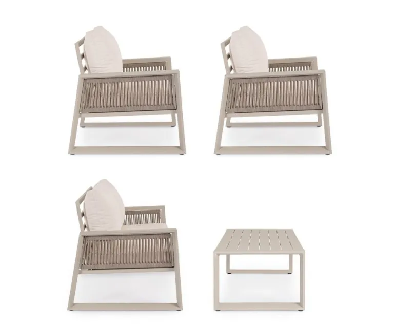 STRUTTURA IN ALLUMINIO, VERNICIATO A POLVERE (POLIESTERE). SEDUTA IN TEXTILENE. INTRECCIO CON CORDE IN TEXTILENE (5MM). CUSCINI SFODERABILI CON TESSUTO IDROREPELLENTE SPUN POLY (POLIESTERE). PIEDINI REGOLABILI. DA ASSEMBLARE.