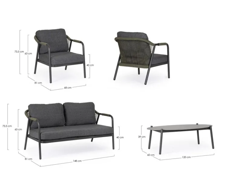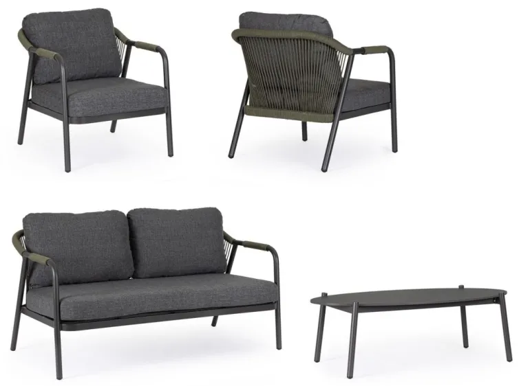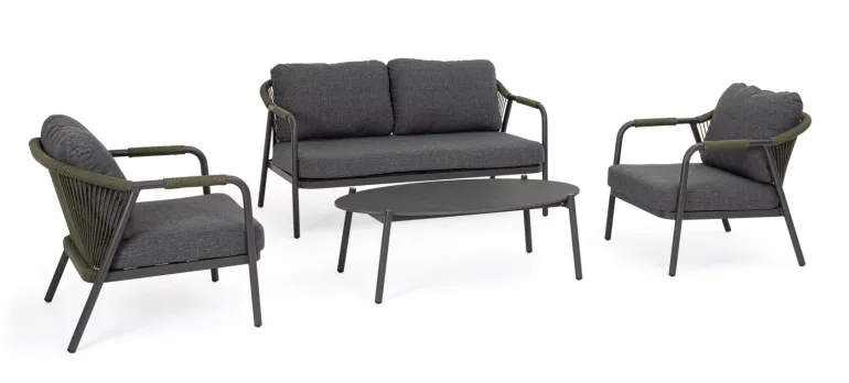 STRUTTURA IN ALLUMINIO VERNICIATA A POLVERE (POLIESTERE). INTRECCIO PER ESTERNO IN CORDA OLEFIN (POLIPROPILENE). PIANO IN PIETRA SINTERIZZATA (PIETRA NATURALE LAVORATA AD ELEVATE TEMPERATURE)(SPESSORE 11MM). CUSCINI SFODERABILI IN TESSUTO IDROREPELLENTE 100% POLIPROPILENE. VITERIA IN ACCIAIO INOSSIDABILE. TAVOLINO DA ASSEMBLARE.