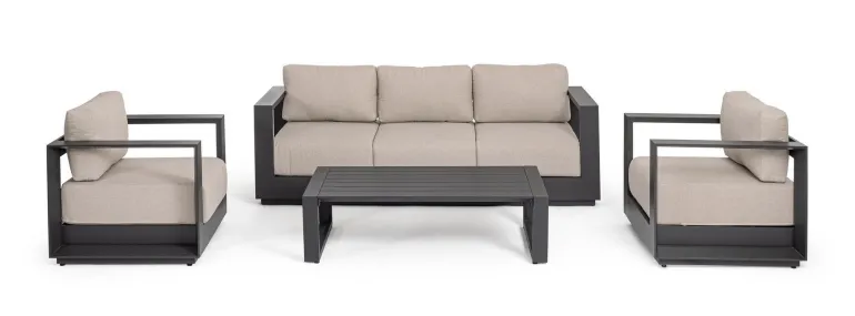 STRUTTURA IN ALLUMINIO VERNICIATO A POLVERE (POLIESTERE). CUSCINI SEDUTA E SCHIENALE SFODERABILI CON TESSUTO IDROREPELLENTE OLEFIN (100% POLIPROPILENE). PIEDINI REGOLABILI. GAMBE TAVOLINO (VITERIA IN ACCIAIO INOSSIDABILE) DA ASSEMBLARE.