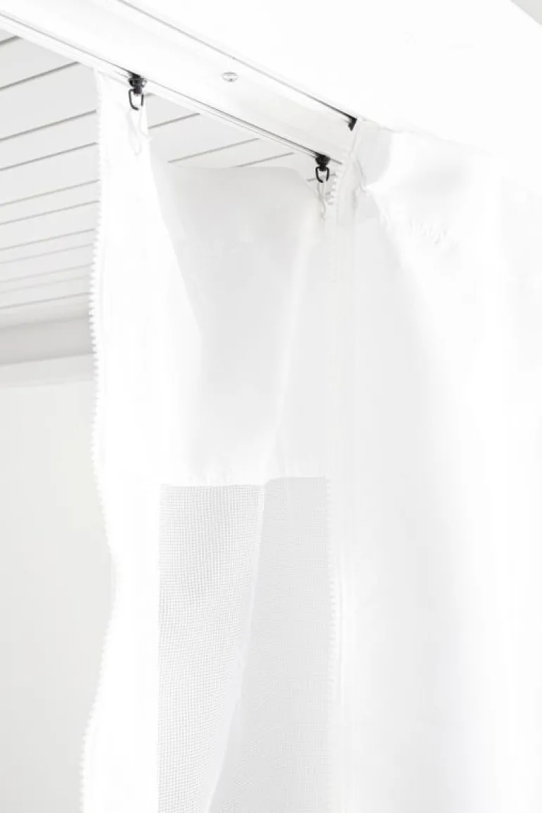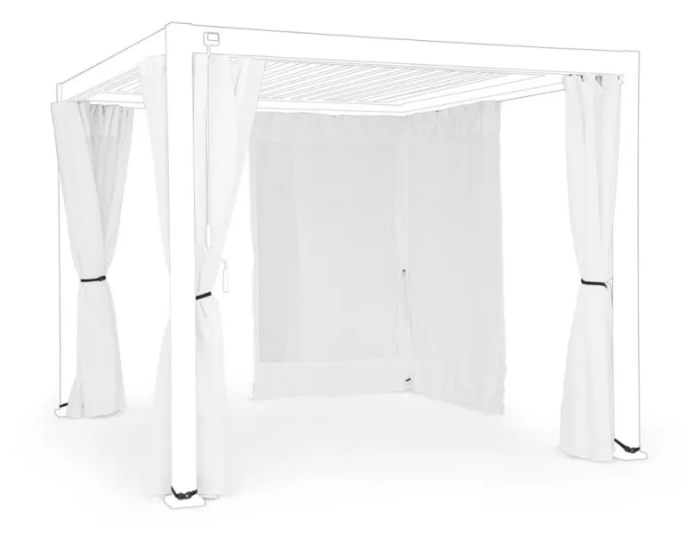 TELI ANGOLARI (FORMA A ELLE) IN POLIESTERE 180GR/M2, ZANZARIERE IN POLIESTERE 70GR/M2. INCLUSO DI BINARI IN ALLUMINIO DA FISSARE ALLA PERGOLA CON VITI AUTO- FORANTI. OGNI TELO E ZANZARIERA E’ COMPRENSIVO DI CERNIERE PER ASSICURARE LA CHIUSURA TOTALE DEL PERIMETRO DELLA PERGOLA.