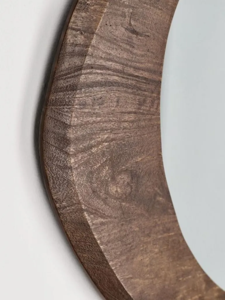 LEGNO DI MANGO FINITURA A BASE DI NITROCELLULOSA E VETRO. MISURE SPECCHIO: Ø47CM