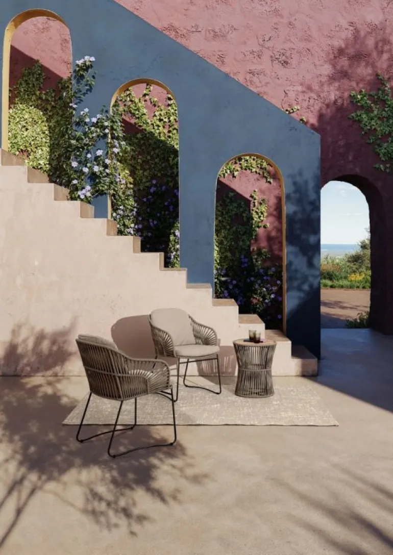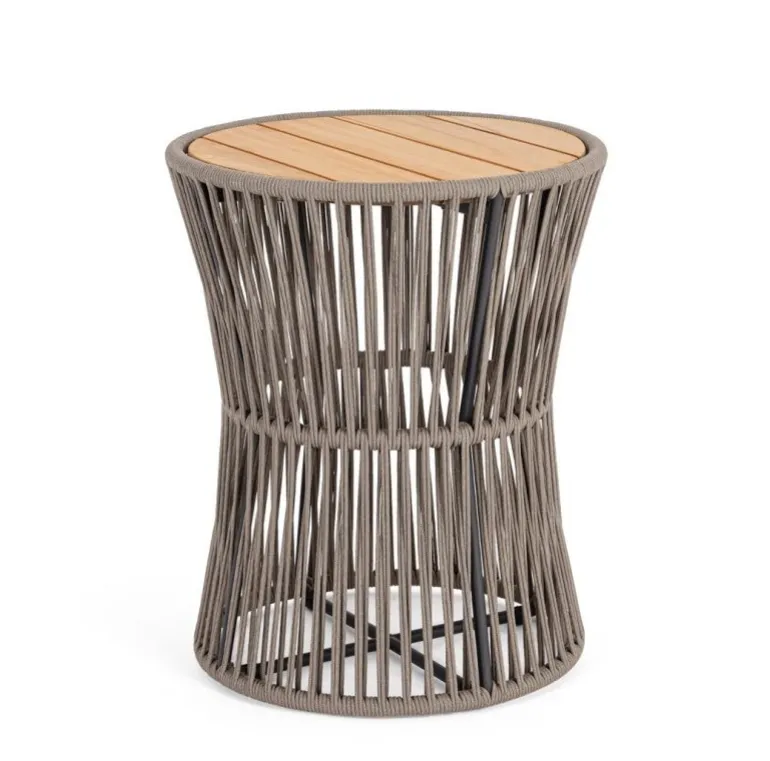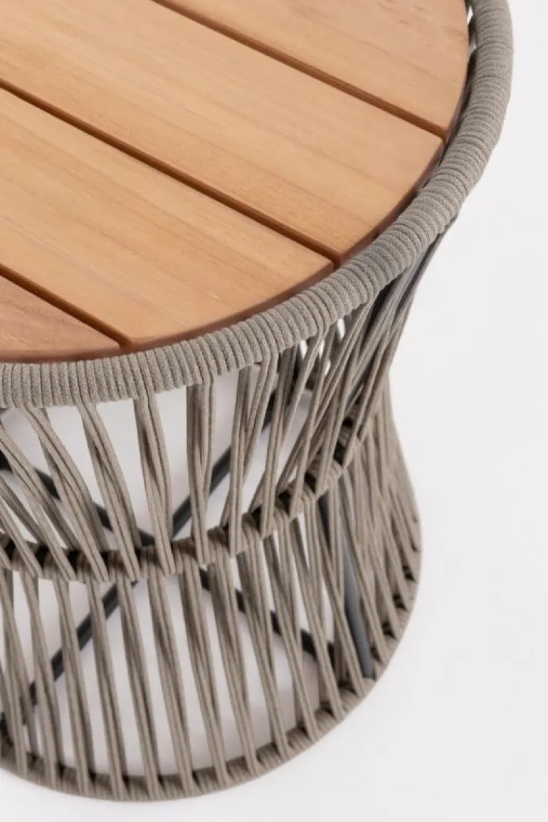STRUTTURA IN ACCIAIO INOSSIDABILE (201). INTRECCIO PER ESTERNO IN CORDA (POLIPROPILENE). PIANO IN TEAK – SVLK (LEGNO CERTIFICATO PROVENIENTE DA FORESTE SOSTENIBILI).