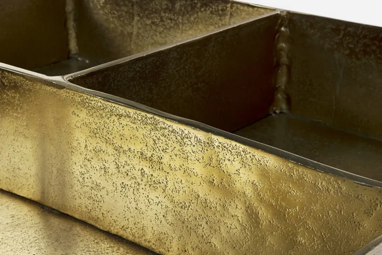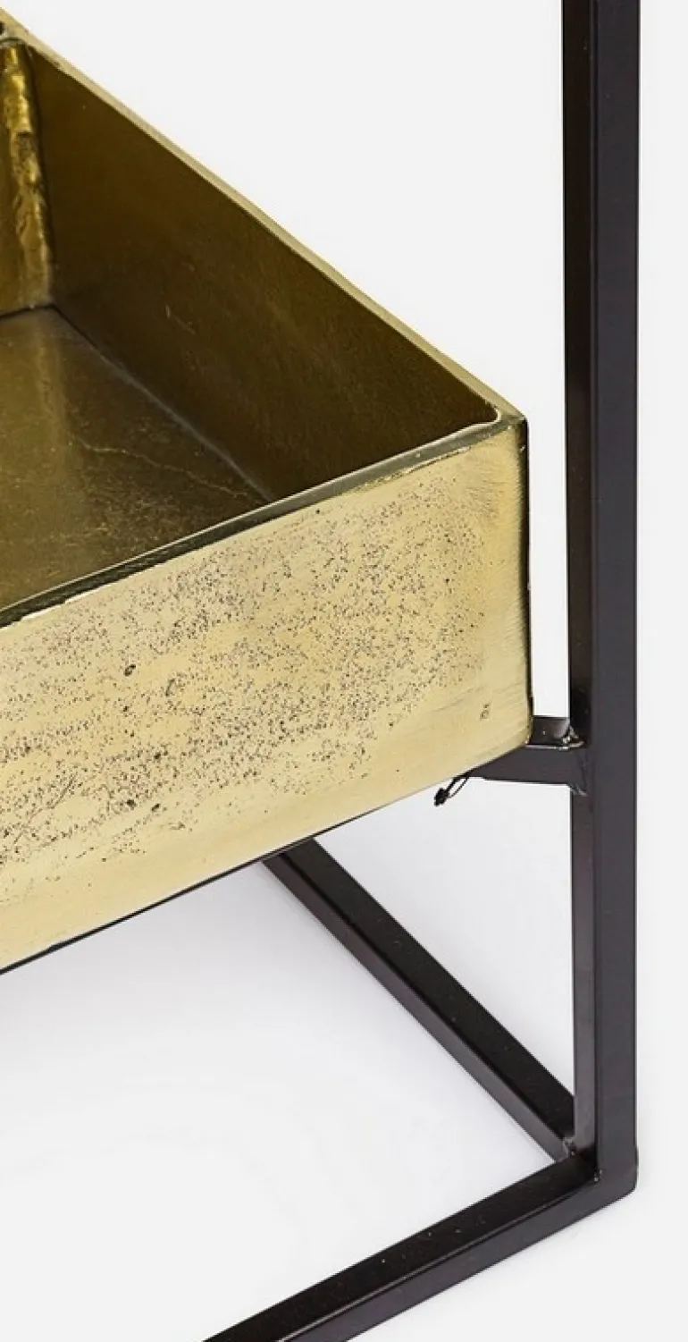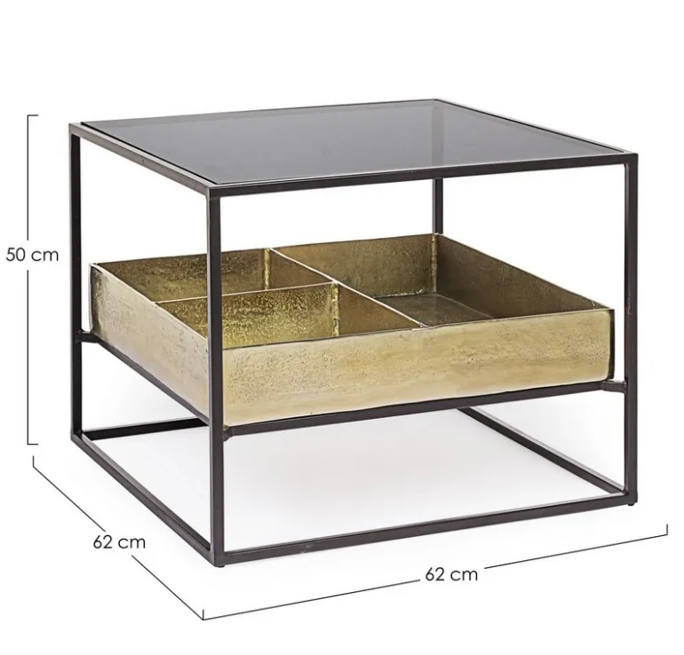 STRUTTURA IN ACCIAIO VERNICIATA A POLVERE EPOSSIDICA. PIANO SUPERIORE IN VETRO TEMPERATO. PIANO INFERIORE CON CONTENITORE IN ALLUMINIO CON FINITURA PLACCATA OTTONE ED ANTICATA.