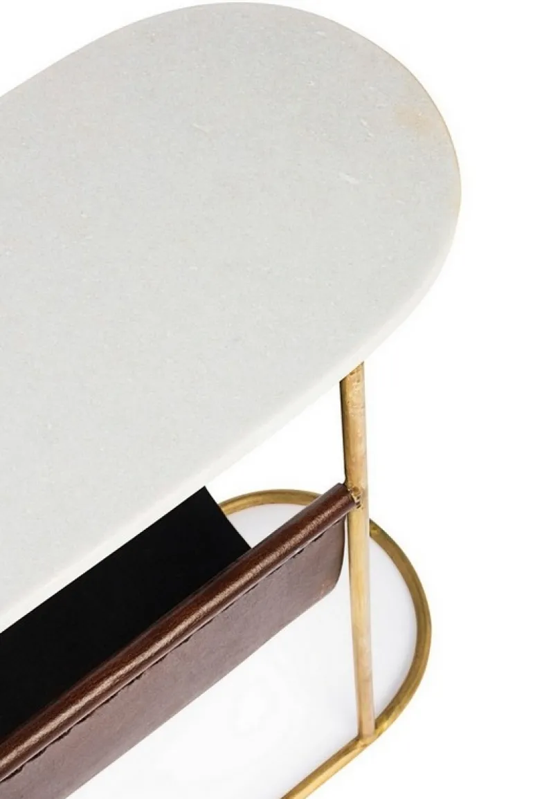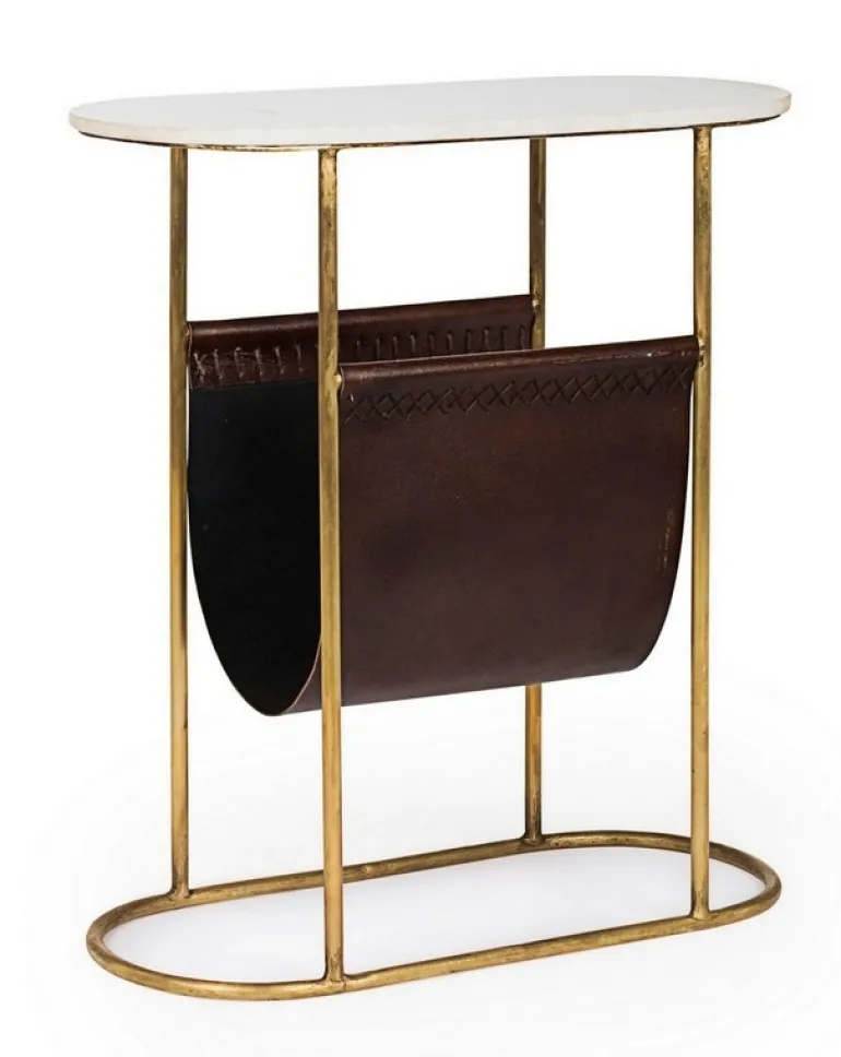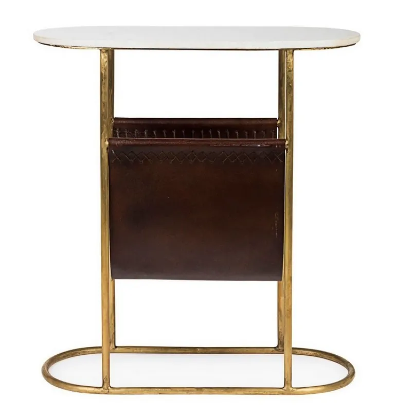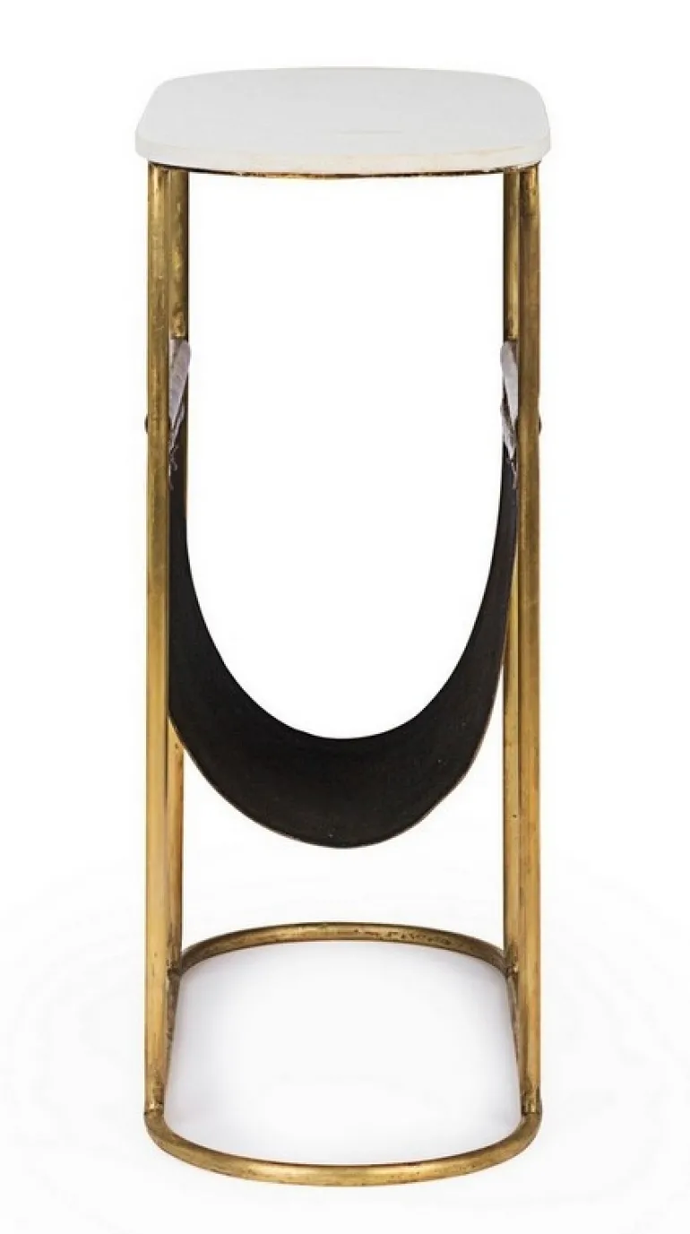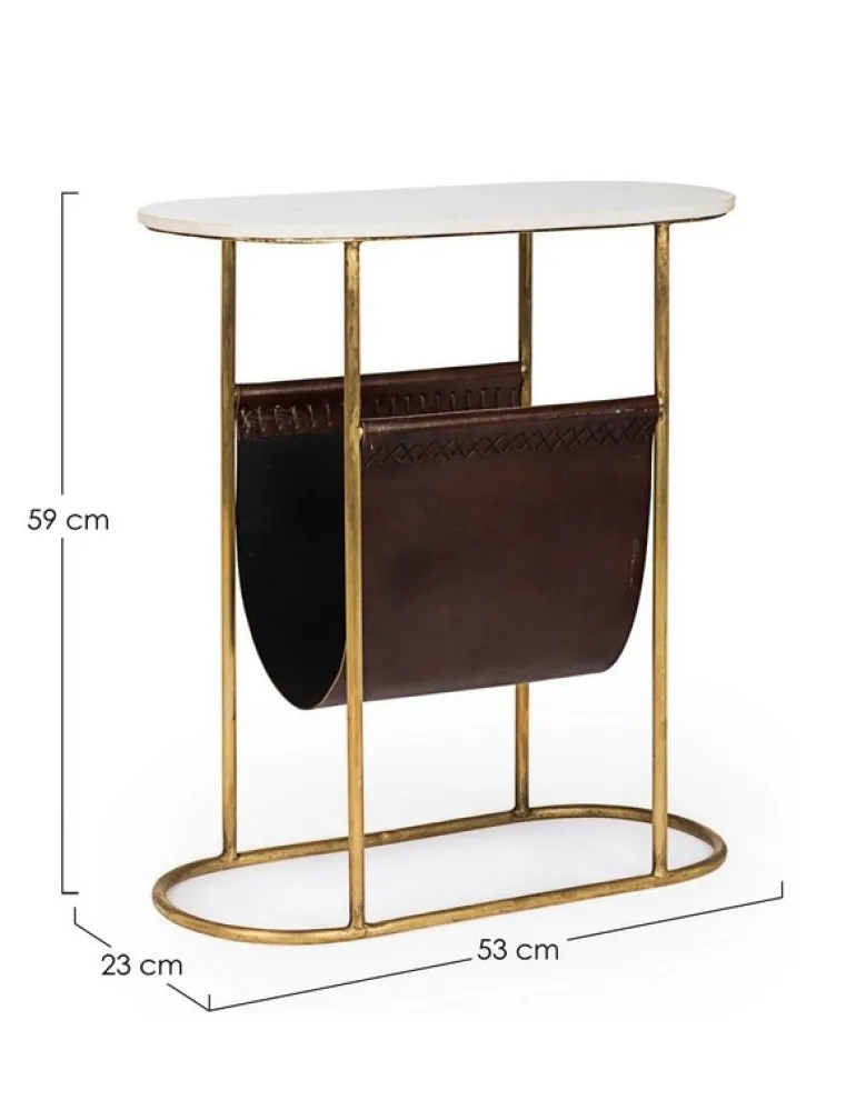 STRUTTURA IN ACCIAIO CON FINITURA OTTONATA. PIANO IN MARMO. PORTA RIVISTE IN VERA PELLE.