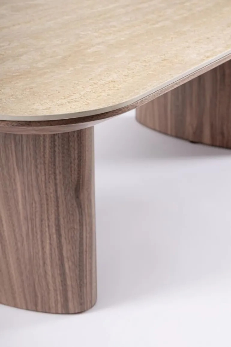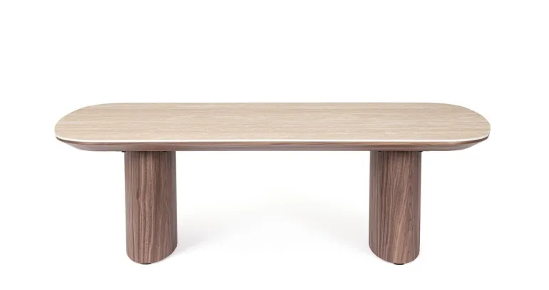 STRUTTURA E GAMBE IN MDF IMPIALLACCIATO LEGNO DI NOCE. FINITURA A BASE DI VERNICE POLIURETANICA. PIANO IN PIETRA SINTERIZZATA (PIETRA NATURALE LAVORATA AD ELEVATE TEMPERATURE) CON EFFETTO TRAVERTINO. GAMBE DA ASSEMBLARE.