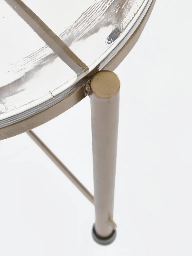 ACCIAIO CON FINITURA PLACCATA ED ANTICATA. PIANO IN VETRO NATURALE LAVORATO A MANO (SPESSORE 15-18MM). LE FORME ORIGINALI CREATE DAL VETRO SONO SOLO INDICATIVE, TUTTI I PRODOTTI SARANNO DIVERSI L’UNO DALL’ALTRO, CON MISURE E COLORAZIONI LEGGERMENTE DIFFERENTI.