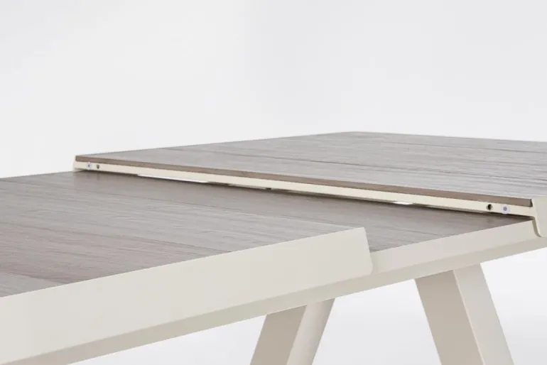 STRUTTURA IN ALLUMINIO VERNICIATA A POLVERE (POLIESTERE). PIANO IN CERAMICA (SPESSORE 10MM).ALLUNGABILE CON PROLUNGA AUTOMATICA. VITERIA IN ACCIAIO INOSSIDABILE. PIEDINI REGOLABILI. GAMBE DA ASSEMBLARE.