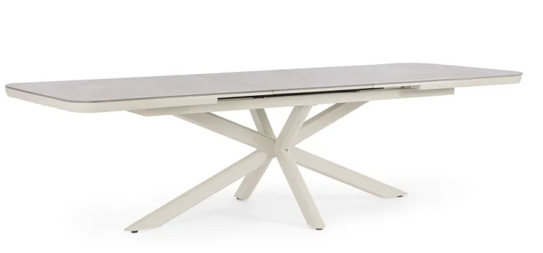 STRUTTURA IN ALLUMINIO VERNICIATA A POLVERE (POLIESTERE). PIANO IN PIETRA SINTERIZZATA (PIETRA NATURALE LAVORATA AD ELEVATE TEMPERATURE)(SPESSORE 11MM) ALLUNGABILIE CON PROLUNGA AUTOMATICA. VITERIA IN ACCIAIO INOSSIDABILE. PIEDINI REGOLABILI. GAMBE DA ASSEMBLARE.
