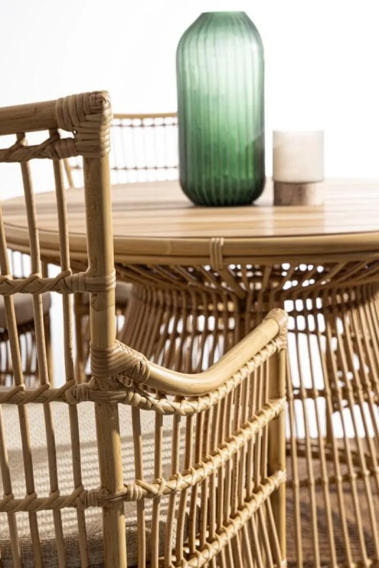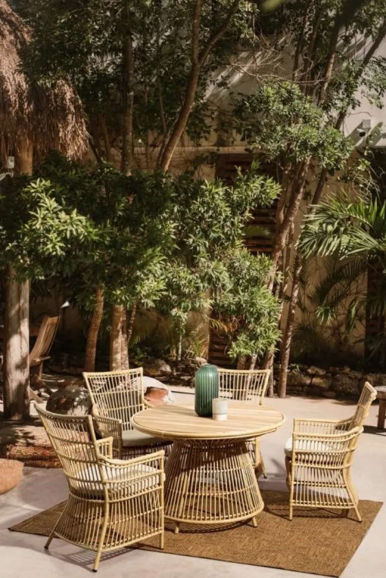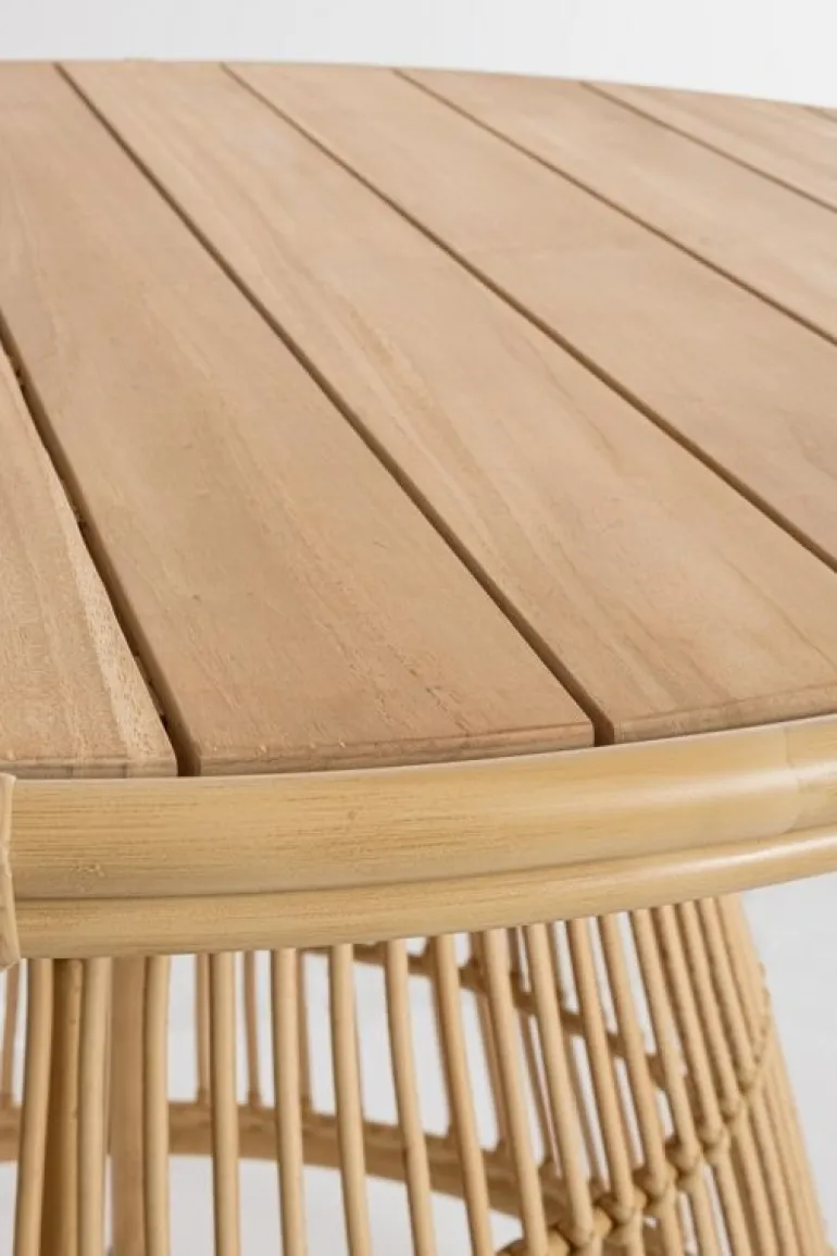 STRUTTURA IN ALLUMINIO VERNICIATO A POLVERE (POLIESTERE) CON EFFETTO RATTAN, INTRECCIO IN FIBRA SINTETICA (TONDO 10MM). PIANO IN TEAK – SVLK (LEGNO CERTIFICATO PROVENIENTE DA FORESTE SOSTENIBILI) CON FINITURA NATURALE.