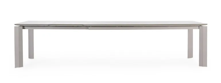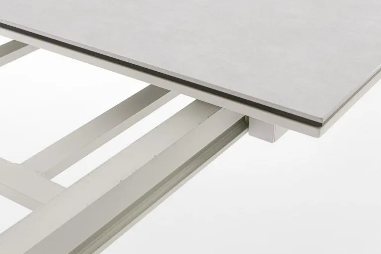 STRUTTURA IN ALLUMINIO VERNICIATO A POLVERE (POLIESTERE). PIANO IN CERAMICA (CON BASE IN VETRO) SPESSORE TOTALE 9MM. ALLUNGABILE CON APERTURA TELESCOPICA. PROLUNGHE ESTERNE CON ALLOGGIO SOTTO IL PIANO. VITERIA IN ACCIAIO INOSSIDABILE. GAMBE DA ASSEMBLARE.