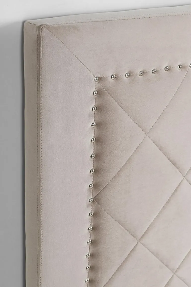 STRUTTURA IN COMPENSATO. RIVESTIMENTO NON SFODERABILE IN POLIESTERE EFFETTO VELLUTO CON APPLICAZIONE DI BORCHIE IN METALLO. IMBOTTITURA IN SCHIUMA POLIURETANICA. PIEDINI IN LEGNO DI PINO.