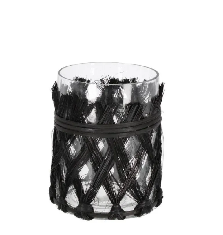VETRO E RAFIA DA PALMA. PRODOTTO FATTO A MANO. EVENTUALI VARIAZIONI DI COLORE, TONALITÀ O IMPERFEZIONI SONO DA CONSIDERARSI UNA CARATTERISTICA DI UNICITÀ. IL MATERIALE NATURALE ESTERNO NON DEVE ESSERE POSTO A CONTATTO CON L’ACQUA. SOLO PER USO INTERNO.
